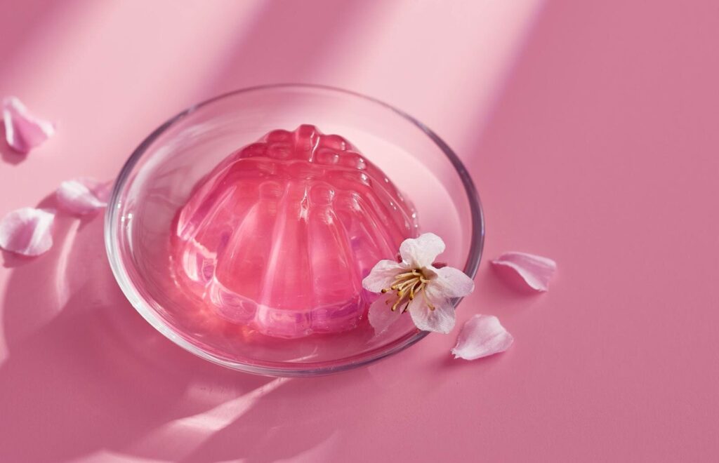 サクラ×ピュアゼリーは、夜空にきらめく星のような“ゼリーの艶感”をイメージした、みずみずしい香り立ちが特徴。トップにはフレッシュなシトラスが軽やかに広がり、桜の花びらが夜空を舞うような透明感のある香調へと続いていく。
